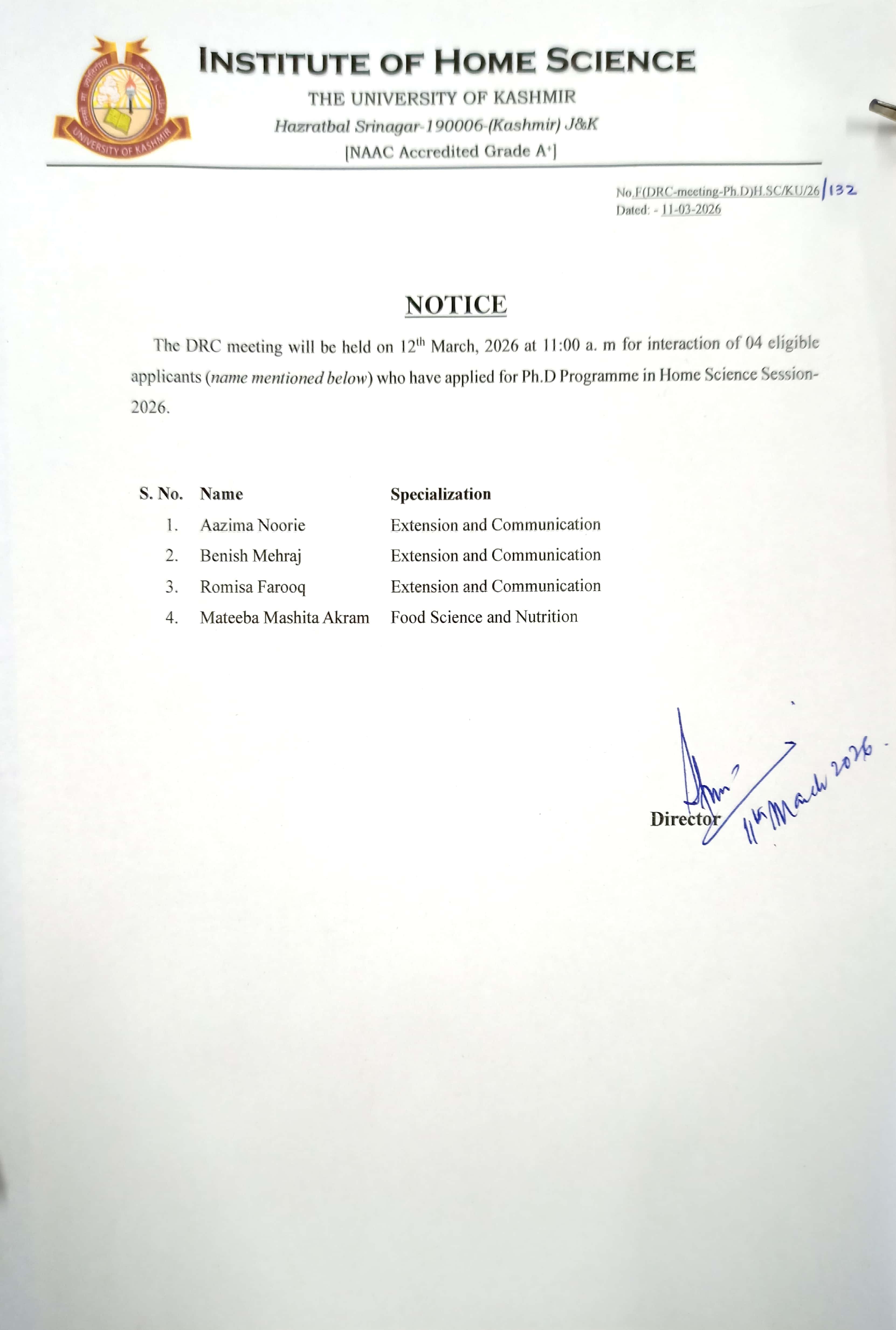 DRC-Meeting for interaction with the eligible candidates who have applied for Ph.D Programme is scheduled for 12 March 2026 Held on: 12 Mar 2026